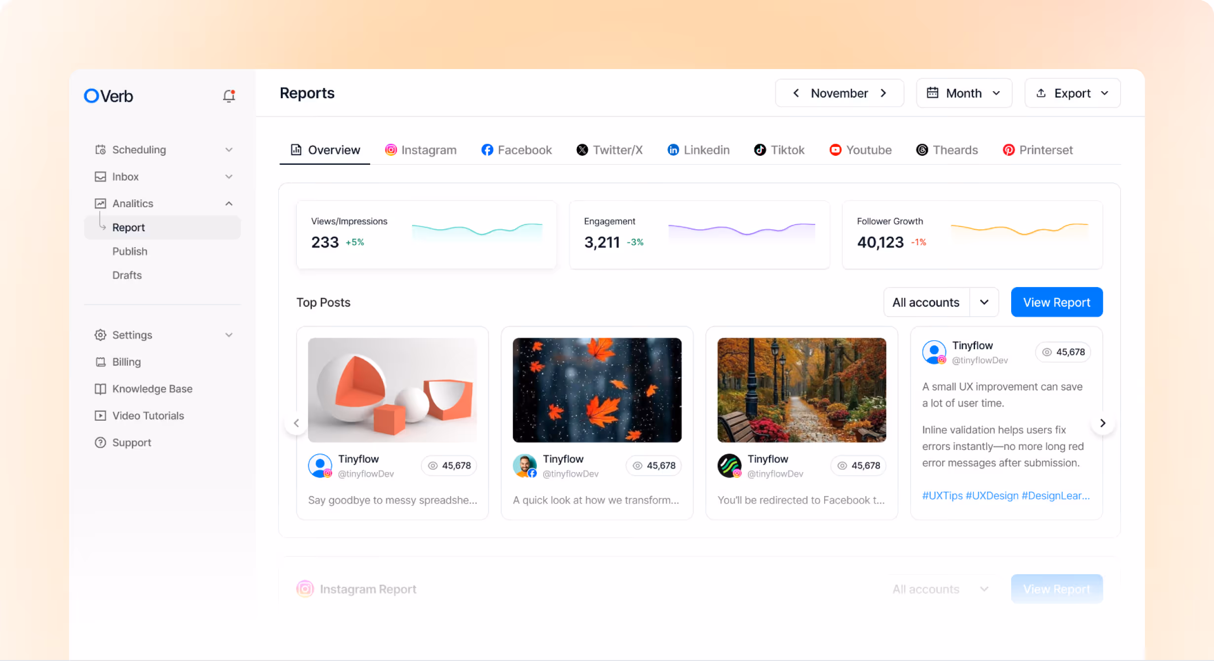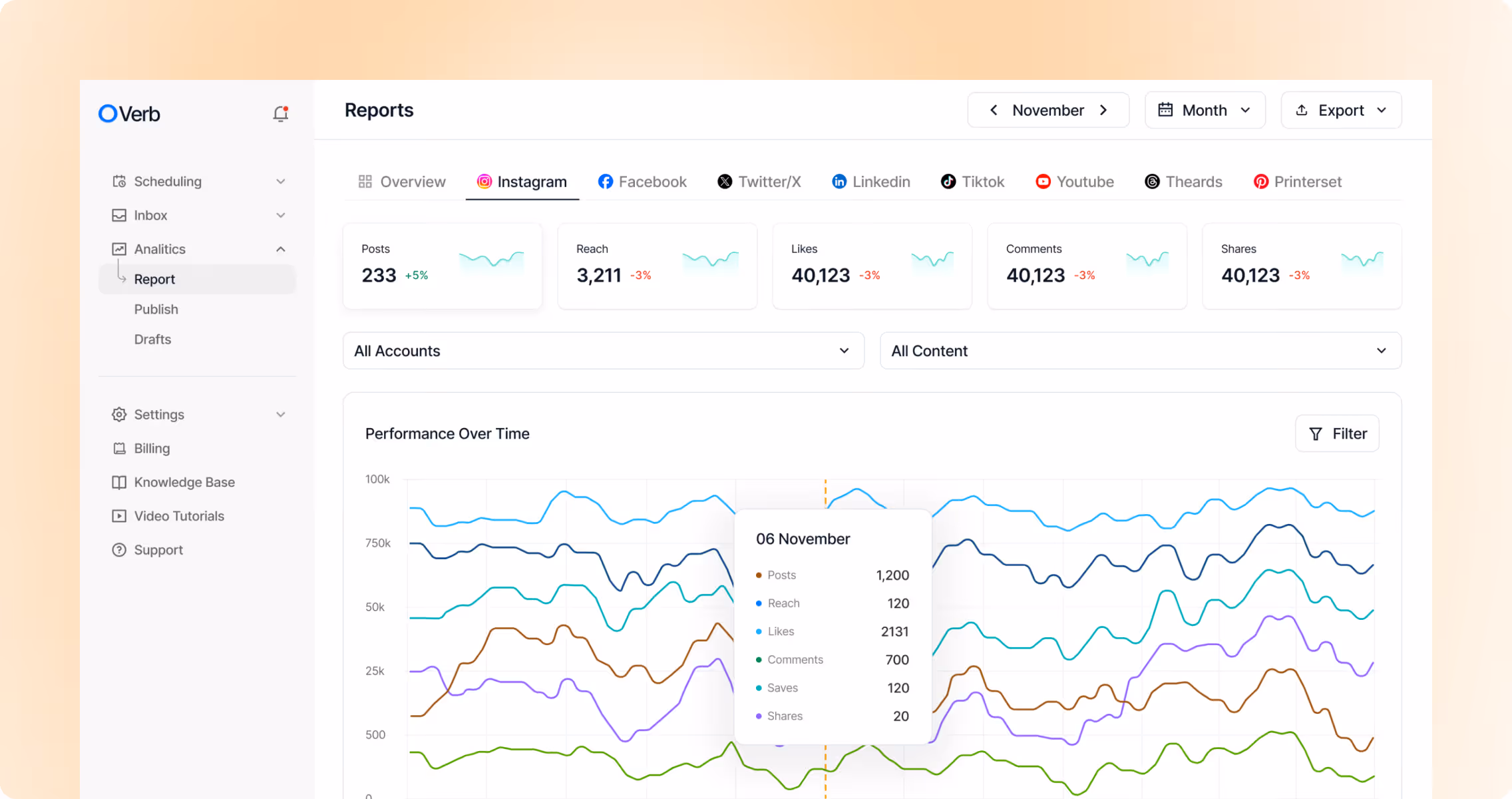 Track reach, engagement, and top-performing posts across every connected account. Export reports in one click.